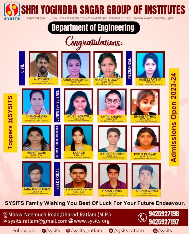 RESULTS 2024-25 SHRI YOGINDRA SAGAR GROUP OF INSTITUTES RATLAM Affiliation & Approvals : AICTE | UGC | RGPV | VIKRAM UNIVERSITY CONGRATULATIONS OUR SYSITIAINS